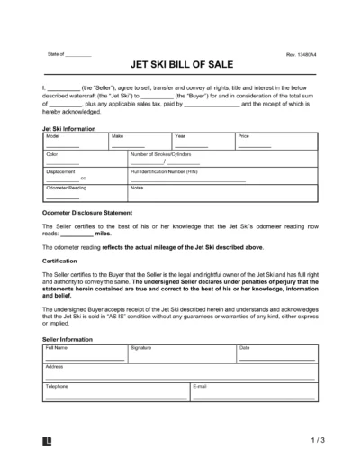 A jet ski bill of sale, also known as a personal watercraft bill of sale, records the transaction details when a jet ski is sold from one party to another. Similar to a vehicle bill of sale, a bill of sale for a jet ski provides proof of ownership transfer from the seller to the buyer, along with the sale price and other information specific to the jet ski.