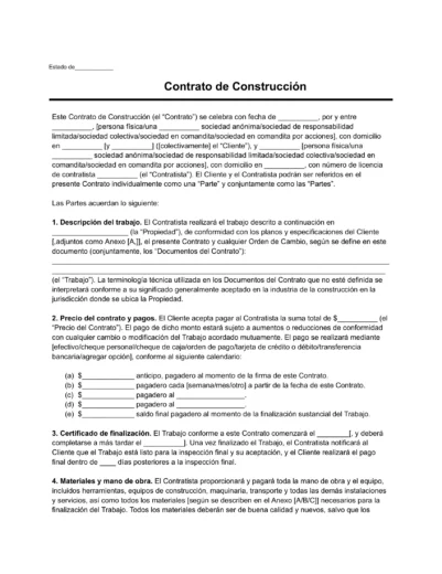 Usa nuestra plantilla para crear tu contrato de construcción personalizado. Completa los detalles del proyecto, los términos de pago y las responsabilidades de cada parte. Descárgalo en PDF o Word e imprímelo para las firmas.
