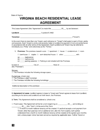 A Virginia Beach lease agreement is a legal document governing the relationship between a tenant and a landlord for the use of a specific property. It includes essential details, such as the lease’s start and end dates, security deposit amount, monthly rent amount, guidelines for returning the security deposit, and both parties’ responsibilities.