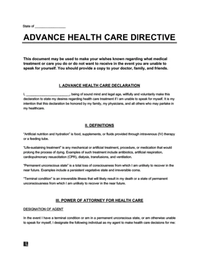 This document outlines your wishes for end-of-life care, including tube feeding and palliative care. It also lets you appoint an agent to make decisions for you. When you give doctors and family members thorough instructions for your medical care in advance, you can prevent confusion and conflict.