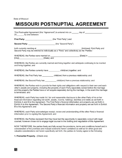 View a sample Missouri postnuptial agreement to learn how to write your own. When you’re ready, create yours using our template. Downloadable in PDF or Word format.
