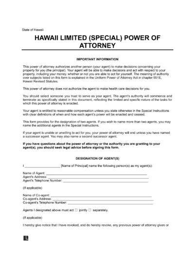 A Hawaii limited power of attorney is a legal document that allows an individual (the principal) to designate another person (the agent) to perform specific tasks or make decisions on their behalf related to their property. The authority granted is clearly defined and limited to the tasks outlined in the document, such as managing financial transactions or handling real estate deals.
