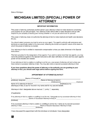 A Michigan limited power of attorney is a legal instrument that allows an individual to designate an agent to perform specific financial duties on their behalf. This document strictly limits the agent’s authority to the duties explicitly detailed by the principal (the person granting the power).