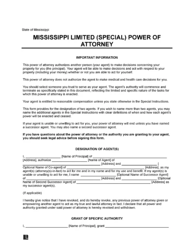 A Mississippi limited power of attorney is a legal document that enables a person to appoint a trusted representative to manage specific personal and financial tasks on their behalf for a certain transaction or time frame. This is particularly useful when the principal is unavailable to act personally, ensuring their obligations are fulfilled by someone reliable and available, who must be consulted beforehand.