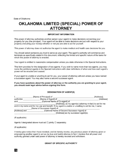 An Oklahoma limited power of attorney form is a legal document that enables a principal to appoint an attorney-in-fact (the “agent”) to represent them in specific transactions or for a designated time period. It is essential to define the scope of the limited authority clearly to prevent any confusion regarding the agent’s responsibilities.
