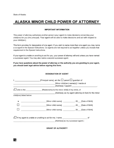 An Alaska minor (child) power of attorney is designed for parents or guardians to delegate temporary decision-making authority for their child to another trusted individual, known as the attorney-in-fact. This document covers various aspects of the child’s care, including healthcare, education, and general welfare, ensuring the granted powers align with the best interests of the child during the specified period.