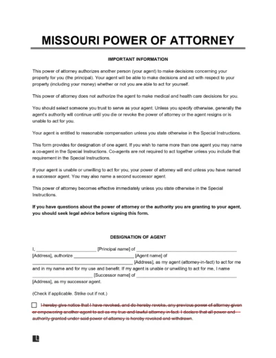 Use our free Missouri power of attorney template to create a contract that works for you and your agent. Add your desired terms with our customizable forms.